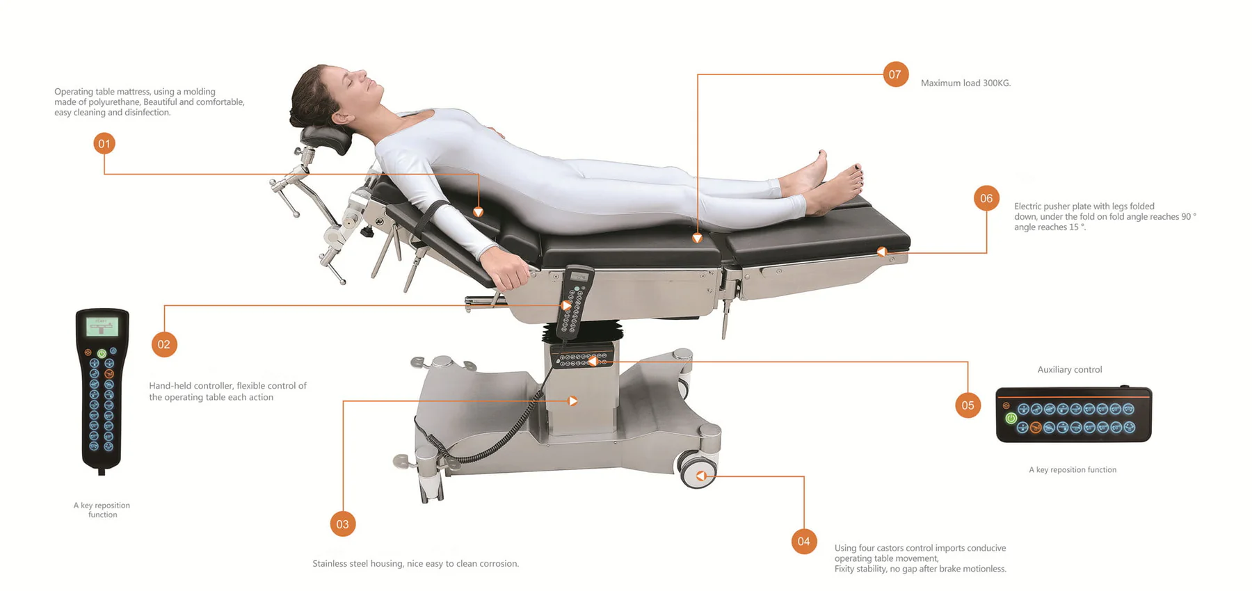 Optional Dual Control System: The table offers dual control through a hand controller and an optional panel, ensuring safe operation during surgery.